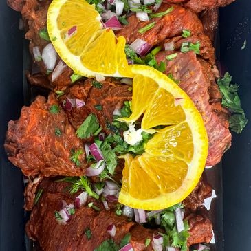 Thinly sliced USDA flap meat marinated with achiote molida, onion, cilantro, lemon, lime and orange.