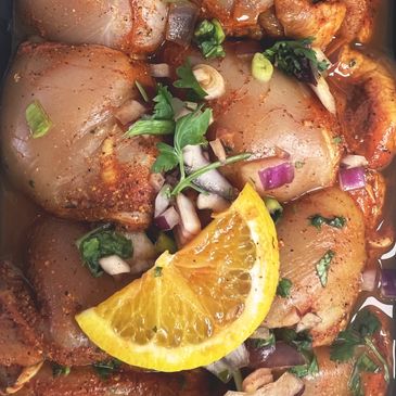 Boneless skinless Jidori chicken thighs marinated with onion, cilantro, lemon, lime and orange